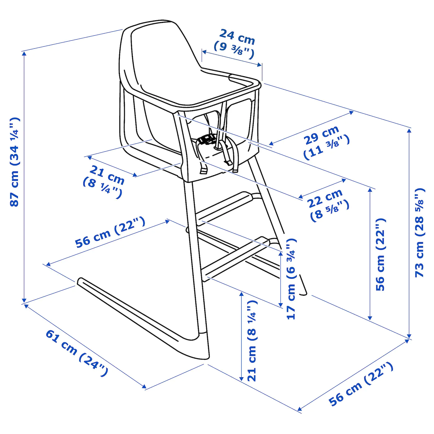 A highchair makes it easier for small children to sit at the same table as adults, which helps them develop social and eating skills. The included safety belt has been designed so it won’t pinch children when securing them in the highchair, and it has a release button which makes it easy for you – and not your child – to unlock the safety belt with 1 hand. You can easily remove the highchair seat shell to transform the highchair into a junior chair when your child is able to sit at the table without being secured. The junior chair’s height is perfect so that your child is able to sit at the dining table – meaning everyone can enjoy mealtime together. Two footrests help the child to easily climb up and down from the junior chair, giving them more independence. The wide L-shaped frame creates a more open space around the chair and makes it stable, so that it doesn’t tip when the child climbs up to sit or climbs down from it. Stands steady on uneven floors because the feet are adjustable. You can stack the junior chair or push it under the table to save space when not in use. The smooth surface has no nooks or corners which are difficult to reach, making the chair easy to clean. Place KOLON floor protector under the child’s chair to make cleaning up after meals easier.Material