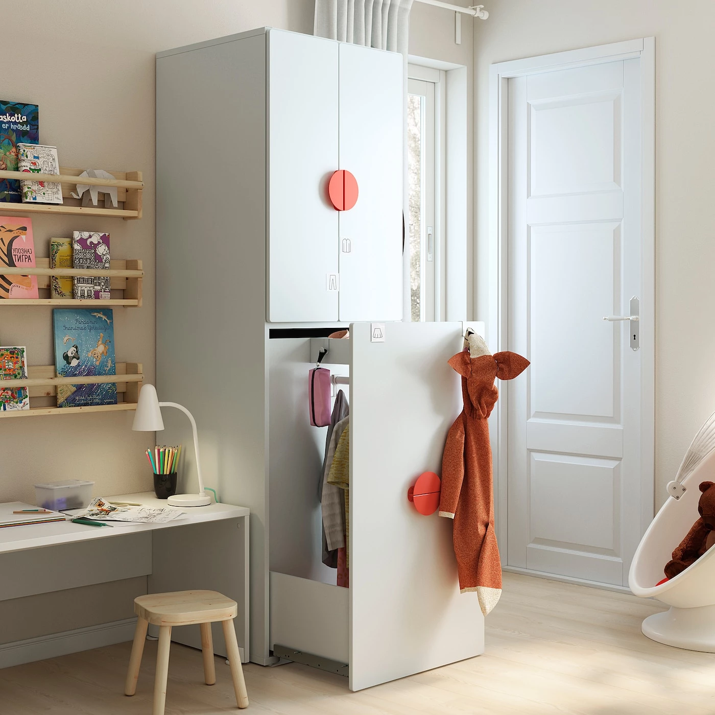 With hooks on the inside and outside, it’s easier to hang clothes, backpacks and other things that would otherwise end up in a pile on the floor. At the bottom of the pull-out storage there is a box for everything that needs to be quickly cleared away. The upper wardrobe has one clothes rail and one wire basket. The older a child gets, the more of the wardrobe they can keep organized on their own.Material